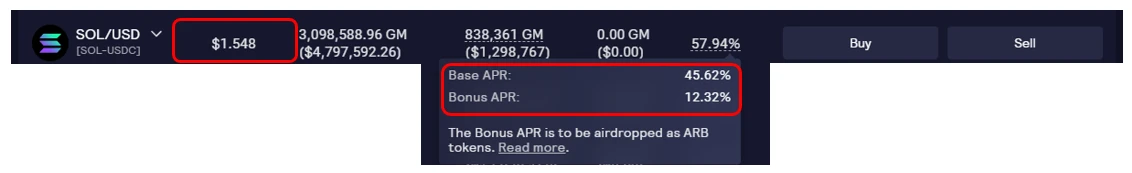 SOL 的 Price 为 1.548 ,由于从 2023 年 8 月 4 日正式上线至今,SOL 价格从 22.79 至今的 58.2 已经有 155% 的涨幅,而建立池子会需要购买大约一半的 SOL 币与 USDC 稳定币,有一半 SOL 贡献了涨幅带来的收益约 72.5% ,代表 Trader 在较大的上涨行情中有 17.8% 的收益,即代表 LP 的 Trader P/L 部分大约损失了-17.8% ;至于 APY,年利率是根据过去 7 天收取的费用计算的。Base APY 取决于整体 SOL 的交易量对应池子的供给量带来的手续费年化收益(45.62% ), Bonus APY 指的是目前第一周 10000 个 ARB 的激励对应池子的供给量带来的激励年化收益(12.32% )。