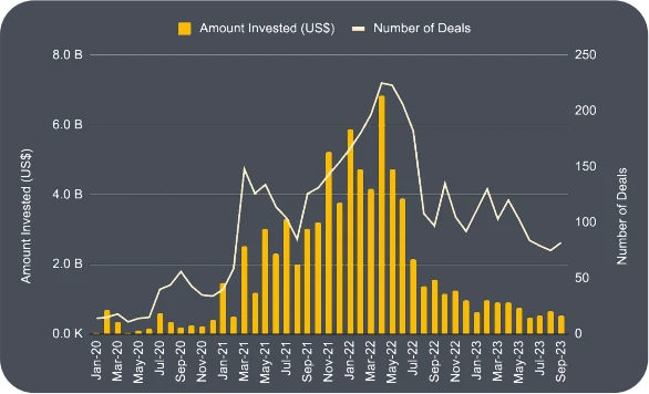 在 2021 年和 2022 年早期的大热牛市,融资总额持续增长。融资金额在 2022 年 4 月达到峰值,达 68 亿美元,相较于 2021 年 1 月的金额增长了 361.8% 。
