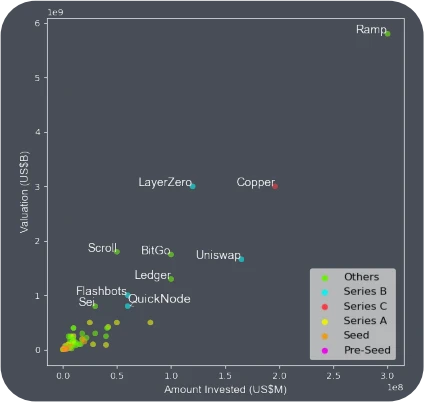 支付解决方案 Ramp 以 58 亿美元估值位居榜首。紧随其后的是全链互操作性协议 LayerZero 以及专注于机构的基础设施项目 Copper 均估值 30 亿美元。