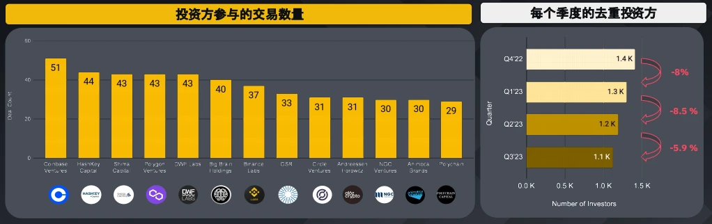 近四个季度,Coinbase Ventures 的交易数量位居榜首,其中 33.3% 流向 DeFi,另有 39.2% 投资到基础设施。 DWF Labs 是新晋入榜的投资方,从 2022 年 10 月才开始其投资活动。此外,尽管每个季度的去重投资方的数量都有所减少,但上个季度的降幅放缓至 5.9% 。