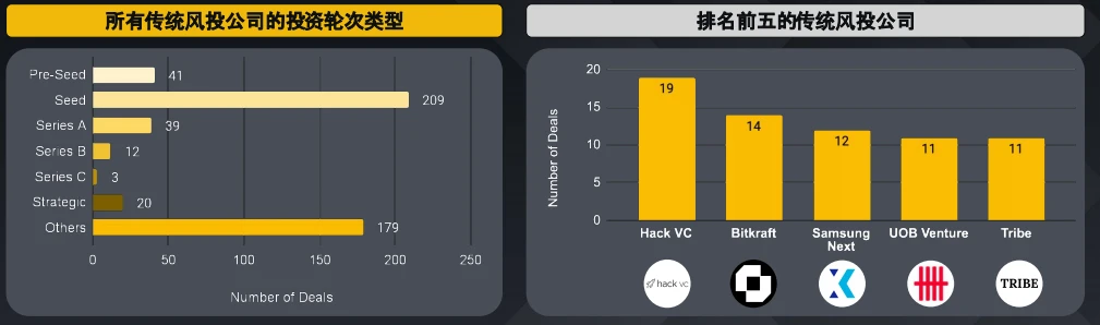所列出的前五大传统风投公司中,只有 Bitkraft 主要专注投资游戏。HackVC 的交易数量最多,并将投资分散到从游戏到基础设施等多个领域。项目包括混合衍生品交易平台 GRVT 和利用贡献度证明机制的 GameFi 平台 DeGame 。