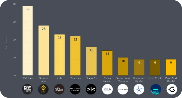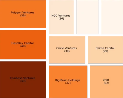 与此同时,Coinbase Ventures 和 Shima Capital 等公司的投资数量减少,或表明这些公司的投资筛选更加严格化。尽管如此,二 者仍是活跃的投资方 , Coinbase Ventures 达成 19 宗交易,Shima 为 17 宗。
