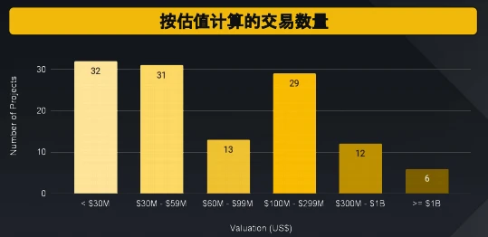 3, 000 万美元以下、 1 亿美元至 2.99 亿美元、 3, 000 万美元至 5, 900 万美元这三个估值等级的项目数量相近。