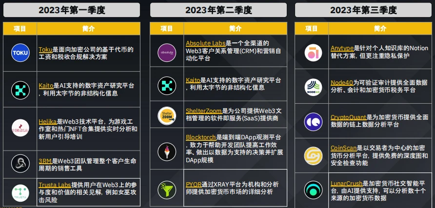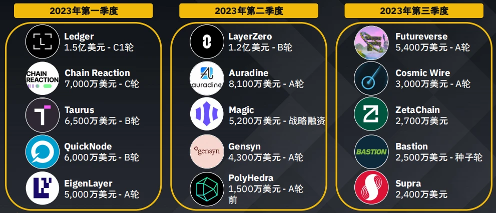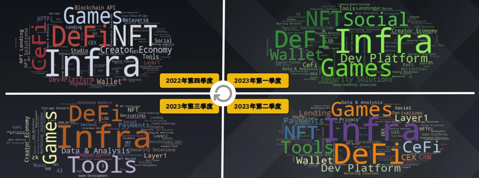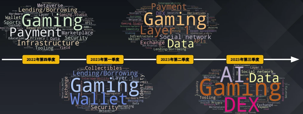 游戏领域持续吸引风险投资的兴趣,这表明人们对这一新兴领域充满期待,最近几个季度人工智能和数据领域的获投也有所上升。2023 年第三季度主要转向了包括 DEX 在内的四大板块。