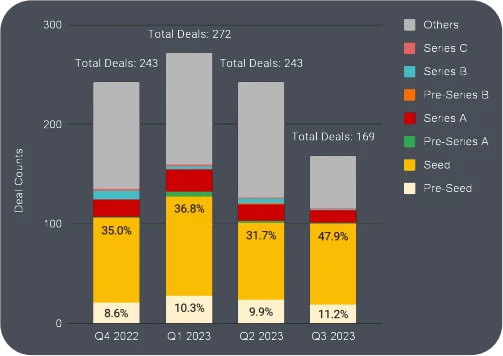 上个季度的种子轮融资占比飙升至 47.9% 。尽管总体交易数量有所下降,但种子轮项目在 2023 年第二季度到第三季度之间从 77 个增加到 81 个。
