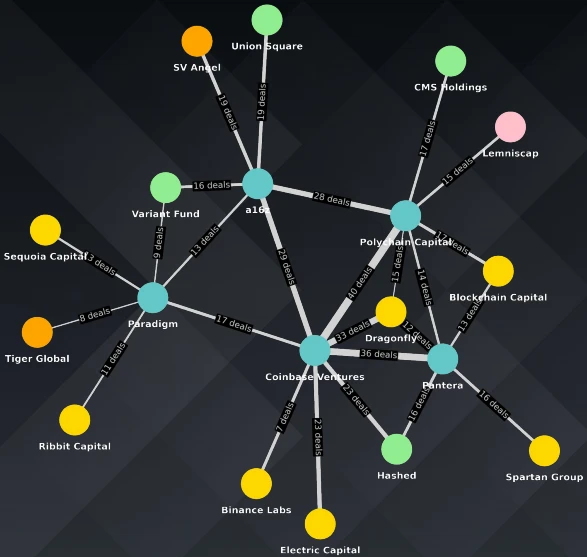 该图阐明了 Pantera Capital 、Dragonfly、 Coinbase Ventures、a16z和 Polychain Capital 等知名风投公司经常共同投资一些项目。