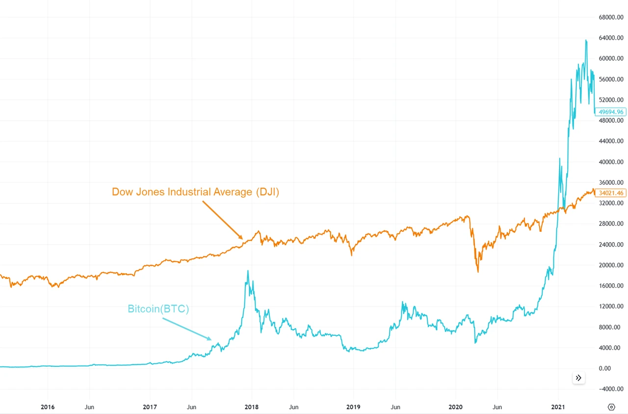从比特币减半历史回顾中,我们得知比特币区块奖励从减半后到触及新的历史价格高点的时间跨度越来越大。相比之下,在 2017 年和 2020 年间,比特币和道琼斯工业指数高点和低点之间的时间跨度越来越小,两者走出了相近的走势。之所以对比特币减半的 4 年牛市周期保持怀疑,是因为价格趋势其实和道琼斯工业指数结合的更加紧密,也就是说比特币与美股在一定时期内相关度更高,而比特币区块奖励减半也许只是幸运时刻而已。