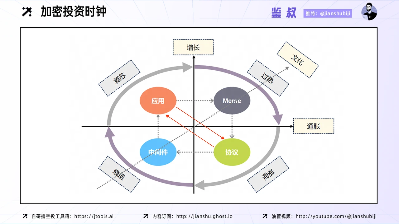 衰退期:中期通胀→低通胀、低增长→中等增长。这将是熊市最困难的阶段,此时作为下一个牛市增长引擎的基础设施正在成熟,但由于资本市场的不活跃,仍然无法在盘面上直接反映经济增长。因此,现阶段我们应该更加关注连接应用和协议的中间件,将中间件成熟和大规模应用的标志作为牛市开启的信号之一。