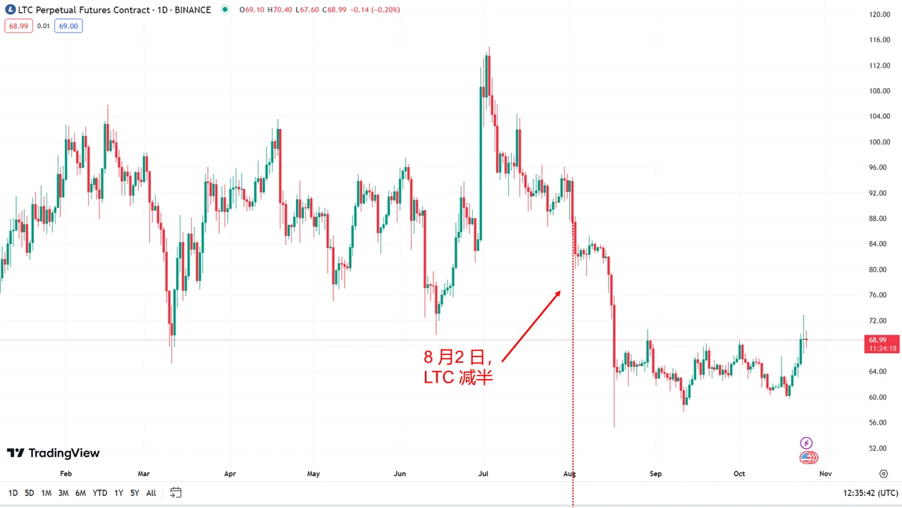在讨论比特币减半之前,我们先来看看不久前减半的 LTC 是什么情况。8 月 2 日 LTC 区块高度来到 2, 520, 000 ,区块奖励减半,挖矿奖励从 12.5 枚 LTC 降低至 6.25 枚 LTC。之后 LTC 价格一路阴跌,虽然可以解释为“利好出尽就是利空”,但是之前 LTC 的价格也没怎么涨,更多的是跟随大盘波动。减半的叙事也没能带动 LTC 价格上涨,那么明年比特币减半还有戏吗?