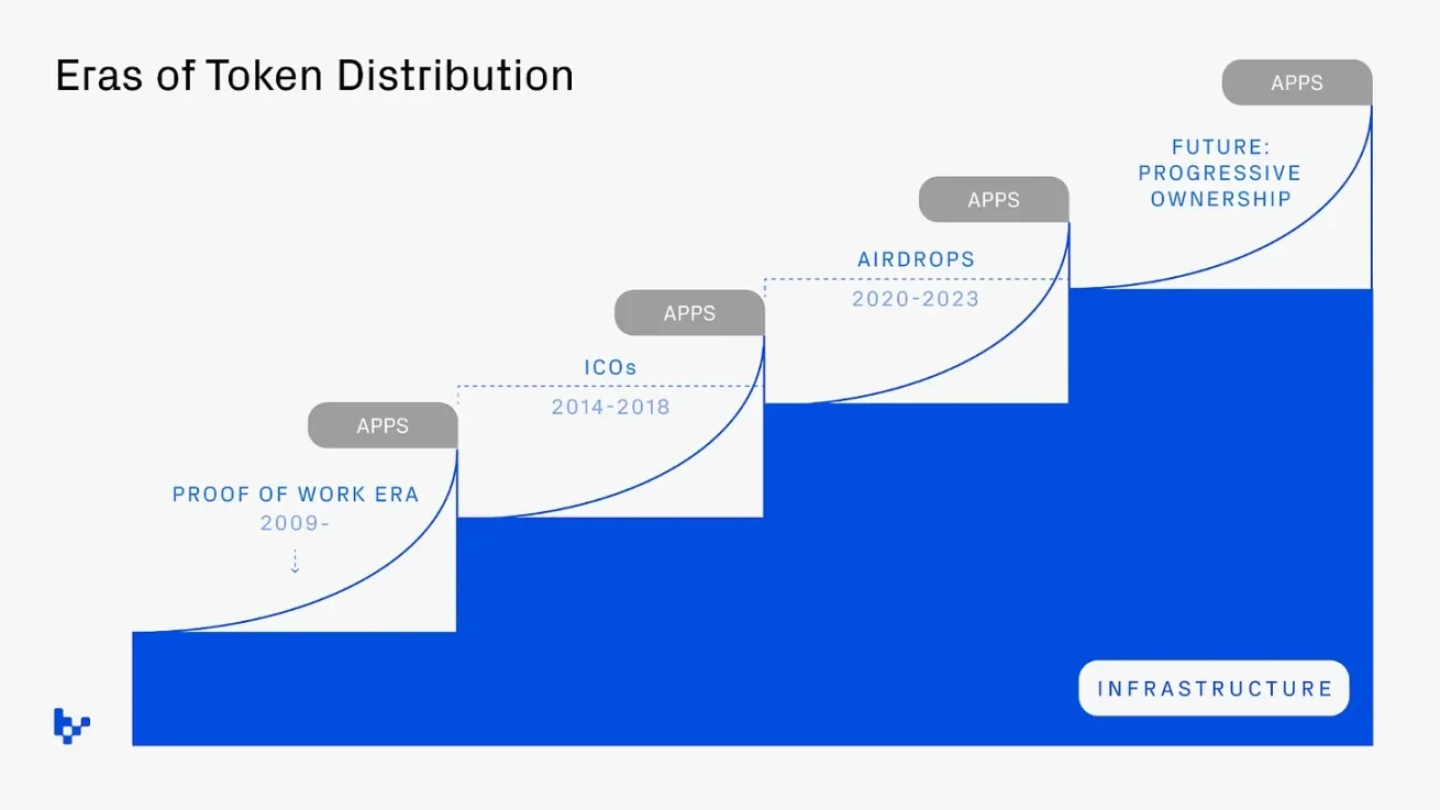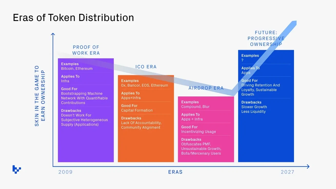 渐进式所有权策略与之前的代币分配时代有很大不同。虽然 ICO 和空投主要是作为引导工具,但事实证明它们在激励有机用户方面往往无效。结果,企业家常常在寻找产品与市场的契合度上误入歧途。