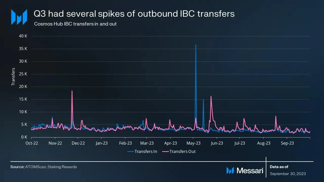 IBC 转入和转出分别下降了 27.3% 和 22.0% 。Cosmos Hub 的角色正从互操作性枢纽转变为安全提供者。