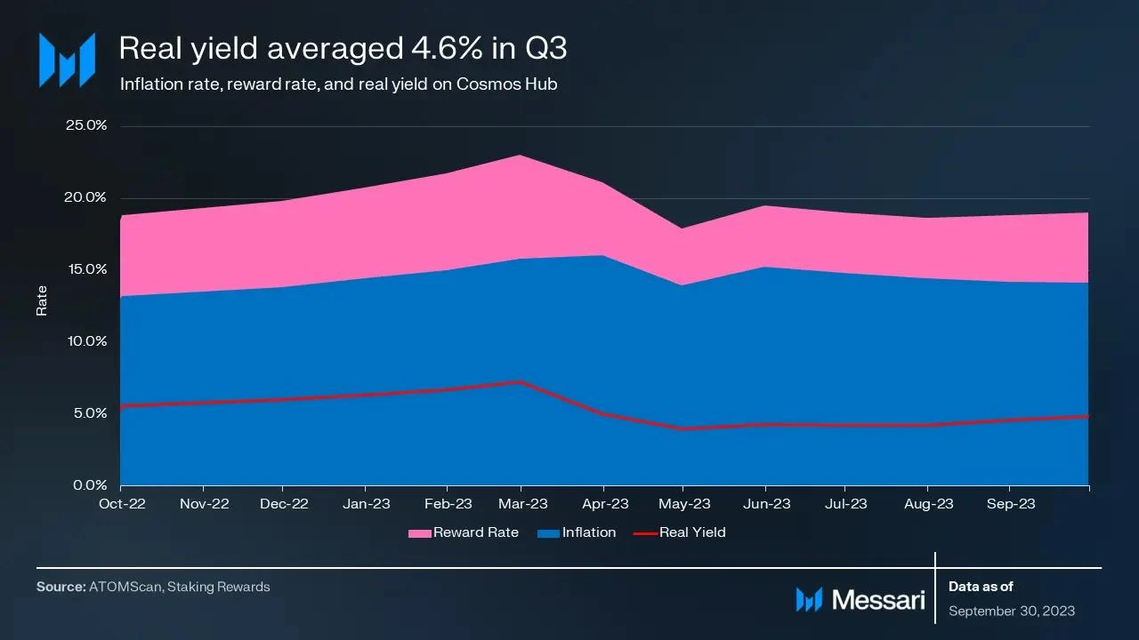 第三季度,Cosmos Hub 的实际收益率平均约为 4.5% ,季度末为 4.65% 。ATOM 的高通胀率约为 14% ,几乎抵消了给予验证者和委托者的约 19% 的奖励率。流通供应主要受验证者和委托者的质押奖励影响。由于奖励率和通胀率都很高,这对不参与质押的 ATOM 持有者造成了沉重的负担。