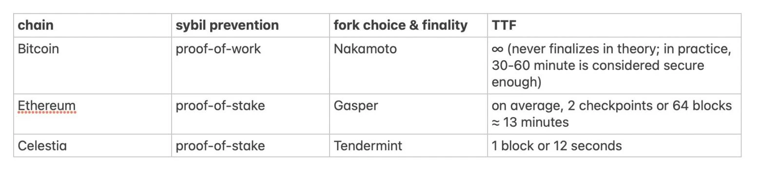 TTF(time to finality)是一个交易信号从开始广播到到达最终状态所花费的时间,以下是几个选定链的 TTF: