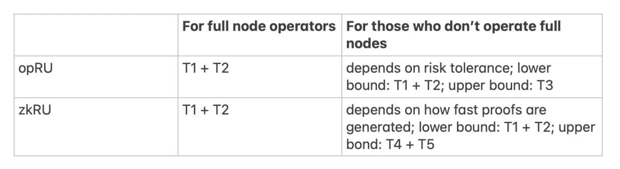 对于轻节点,他们必须等待 ( 1) 和 ( 2) 完成。对于 opRU,(2)的时间为挑战期;对于 zkRU 来说,时间是证明者生成并发布有效性证明后。