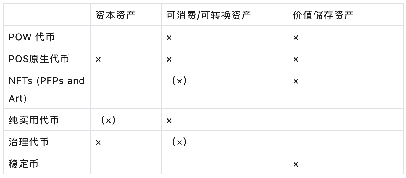 比特币显然既具有可消费 / 可转换资产的属性(因为它需要支付交易费用),也具有价值存储资产的属性(因为它需要货币溢价,并具有政治经济意义)。此外,以太坊还具有资本资产的属性,因为它通过股权奖励向其持有者提供经常性收益。