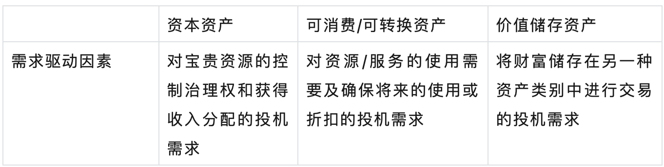 现在我们已经将不同类别的代币分类到超级资产类别的框架中,让我们来看看是什么推动了对每种代币的需求。