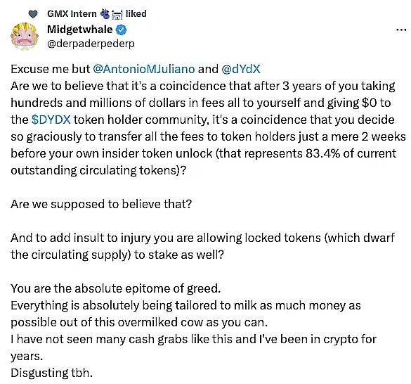 有些代币解锁有点争议,例如 dYdX。