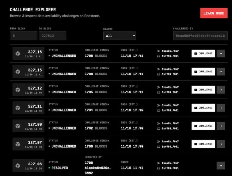 而为了确保这种数据可用性,Redstone 设置了一个单独的数据可用性挑战(DA Challenges),允许任何人(节点)挑战与 L1 上给定承诺相对应的数据的可用性,可以在 Rollup 输入仪表板上检查承诺数据并质疑承诺。