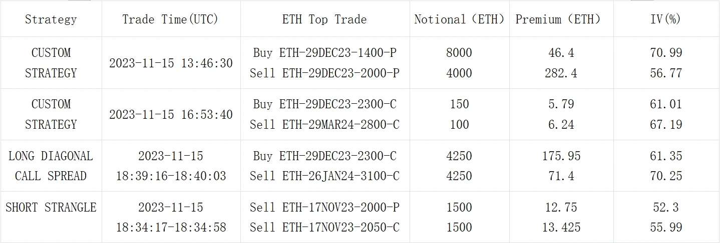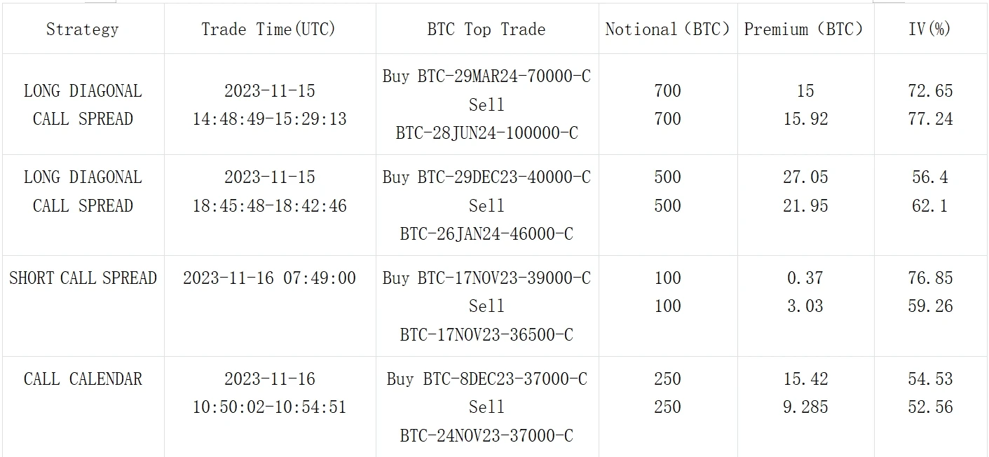 另一方面,SEC 原先应该在本周五前对 ETF 申请作出回应, 但从其对 Hashdex ETF 的回应文件来看,该决议批准将推迟到 2024 年,且很可能也会影响其他机构的 ETF 申请 ,于此同时,我们也关注到大宗市场上的 投 资分布开始向远期转移 ,出现以 BTC Long 29 Mar 24 70000 C vs Short 28 JUN 24 100000 C 为代表的长期限看涨三角价差策略,类似的交易也同样在 BTC/ETH 年底期限上发生。除此之外,看空 BTC 近期上行波动的策略也受到关注,如 Short 17 Nov 的 Call Spread 和 Buy 8 Dec Short 24 Nov 的 Call Calendar。