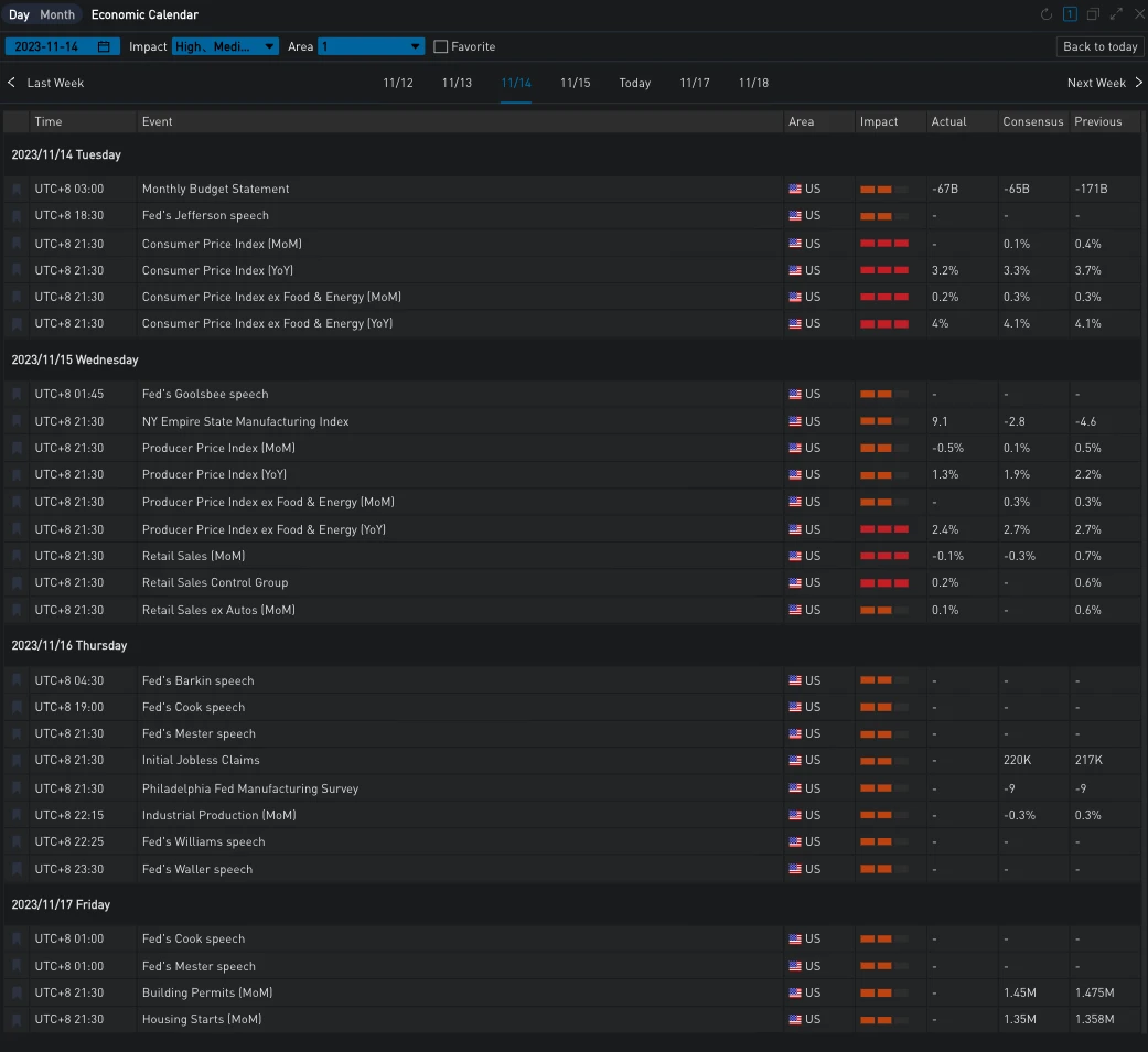 昨日(15 Nov) 美国 10 月零售销售月率录得-0.1% ,为过去七个月以来首次下降 ,略强于预期的-0.3% ,前值为 0.9% ;此外, 美国 10 月 PPI 指数弱于预期 ,录的-0.5% ,创下自 2020 年 4 月以来最大跌幅, 再次强化了通胀降温的表现 ,但美联储官员戴利(旧金山联储主席)作出 警告 称,如果过早宣布抗击通胀取得胜利,而后再面临不得不再次加息的境况,将危及美联储的信誉。美债收益率在盘中冲高回落,当前两年期/十年期收益率分别报 4.888% /4.502%
