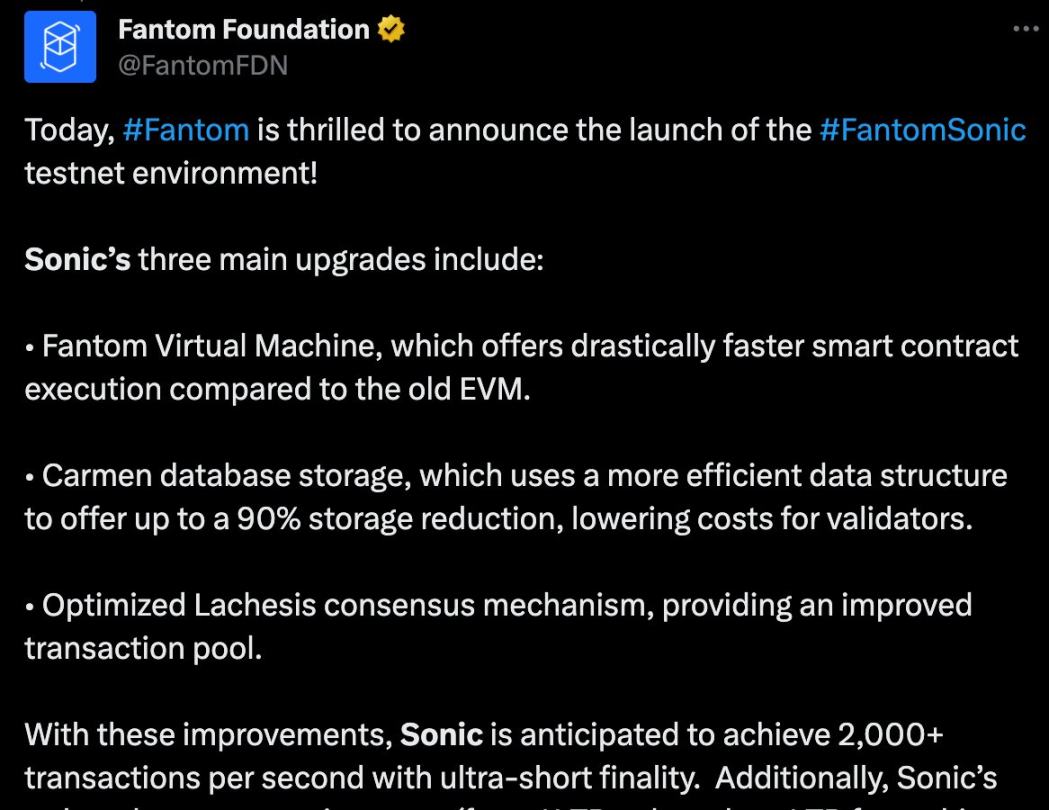 Fantom :通过 Sonic 升级改进单体式区块链设计,无需分片或 L2 即可实现 2000 TPS,目标是吸引新一代 DApp。
