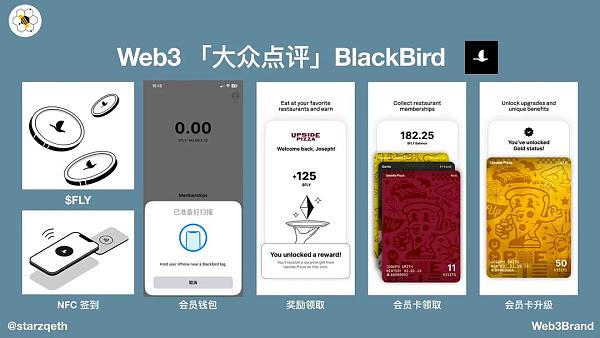 Blackbird App作为顾客的参与界面,为顾客提供了一种利用其NFC芯片实现的积分管理方式 。顾客可以通过App实现签到并获得$FLY代币,同时管理自己的积分和会员权益,例如领取会员卡、升级会员以及其他权益领取。