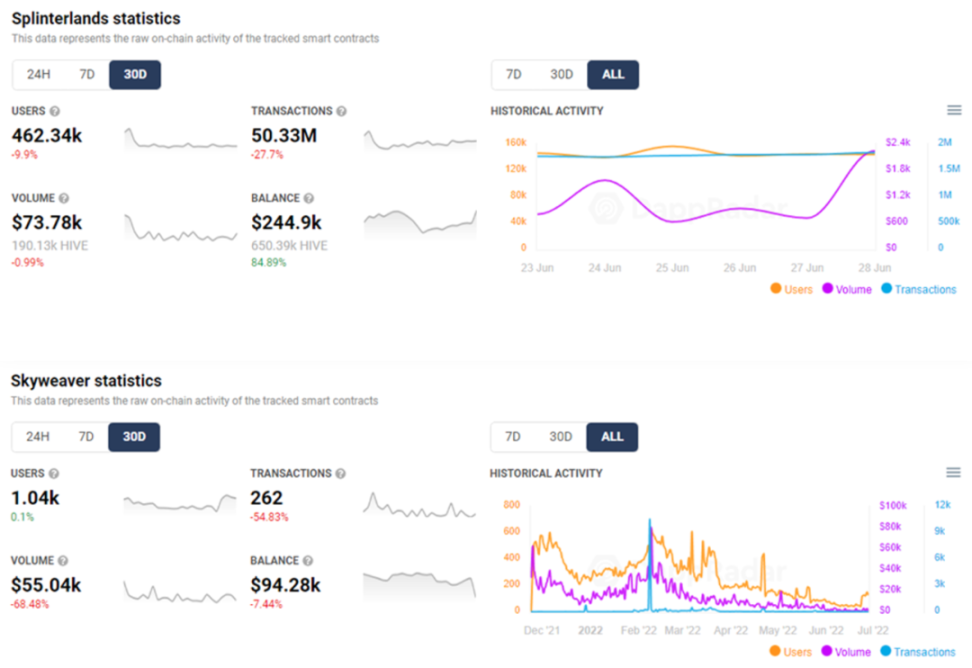 由于 2022 年后各个数据分析平台缺乏 Skyweaver 的数据,我们看看最接近的时间点 2022 年中的游戏数据,可以看到 Splinterlands 的用户数和交易数远超 Skyweaver,并处在一个比较稳定的态势。自 2021 年 7 月之后,随着 TCG 游戏的流行,Splinterlands 迎来了前所未有的成长并逐渐进入稳定期,而 Skyweaver 经历了两三年的测试,仍旧没有突破冰川纪元。