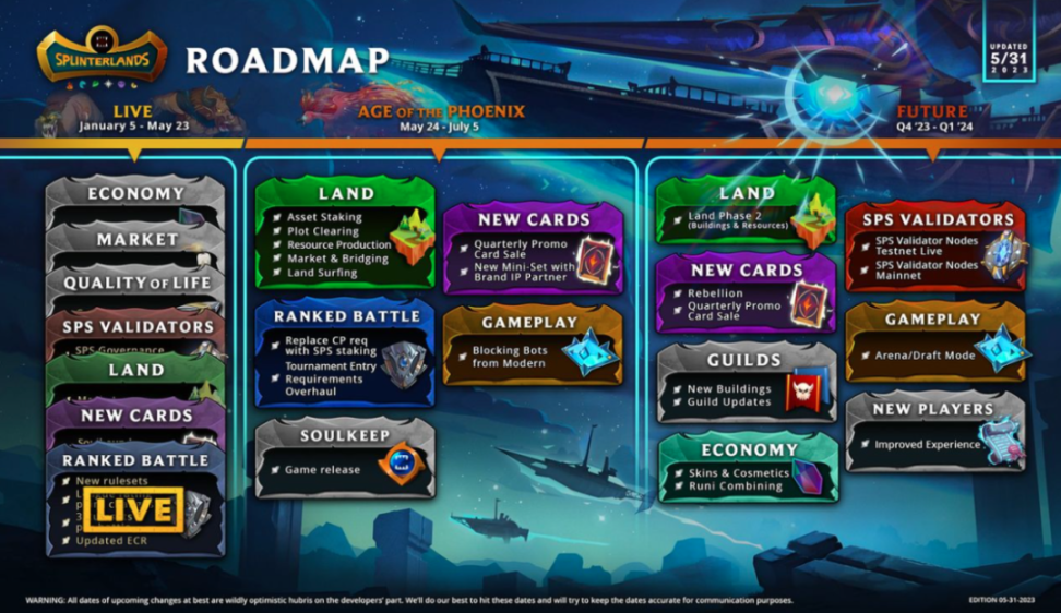 Splinterlands 有着更多样的收益玩法,是具备一定可玩性下比较高效的打金模式,更贴近早期 GameFi 的设计,游戏的双代币模型也是更多是为了服务经济属性而设计,SPS 的空投和开放的治理权更是带来社区低成本的自来水营销和极具粘性的早期参与者,使得 Splinterlands 的热度层层推进,红极一时。Splinterlands 公布的路线图不仅明确,更是有着以土地为基础的元宇宙世界,贴近当时的热门叙事,带来了更高的讨论热度和参与量。