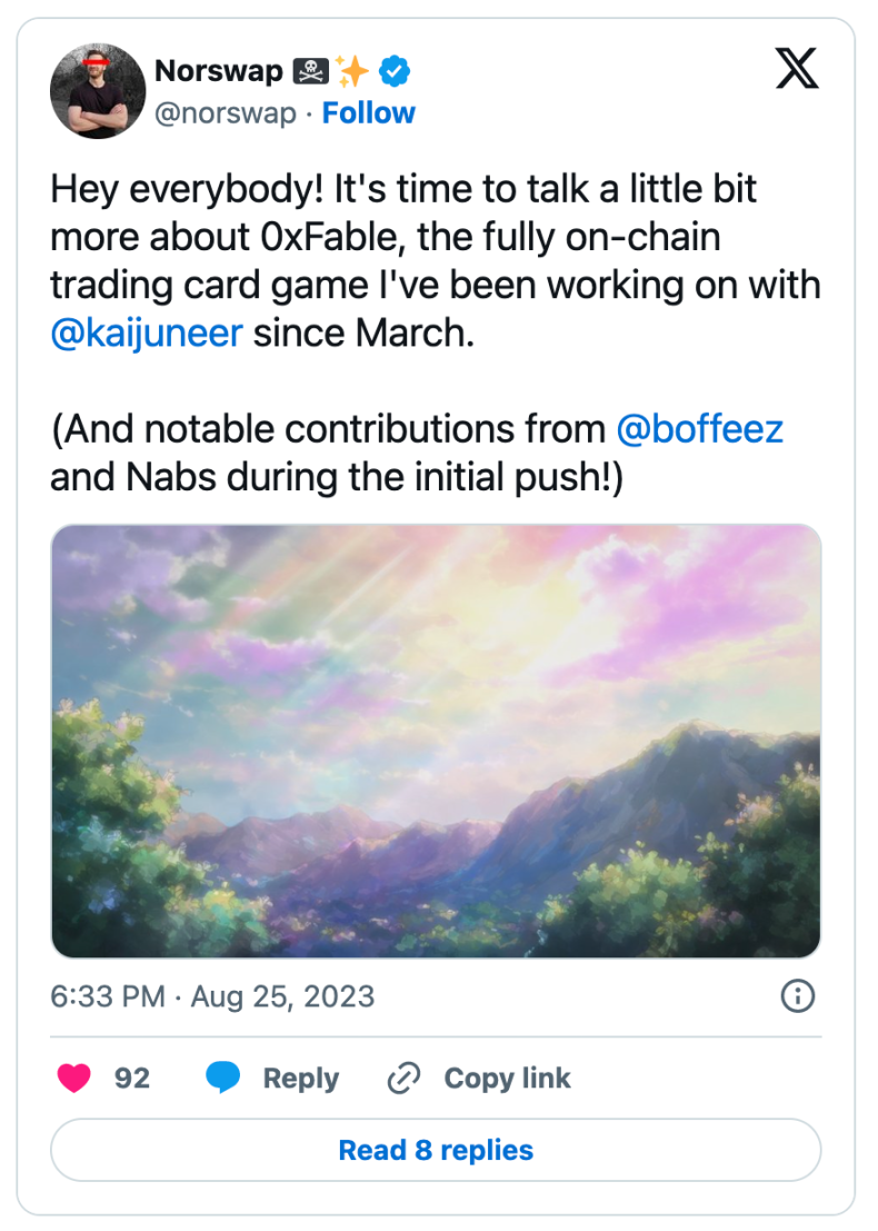 近期,全链游戏的讨论越来越多,不少观点似乎认为全链游戏才是链上游戏的唯一解。8 月份的时候,Norswap 在推文里表示 0x Fable 想做一个可扩展性强的全链 TCG,而 Paradigm 和 Base 支持、要发展一个链上世界的卡牌游戏 Parallel 也开始公测并投入运作。然而,一个很值得讨论的问题是,我们真的需要一个全链的 TCG 吗?