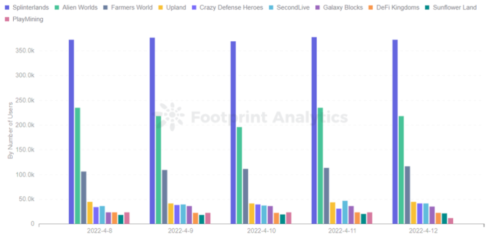 可以看到,截止 2022 年 4 月 12 日,Splinterlands 以超过 35 万的日活跃用户数多次排名第一,将第二、第三名甚至 Axie Infinity 远远甩在身后,可以说一时间风头无量,当之无愧的链游之王。