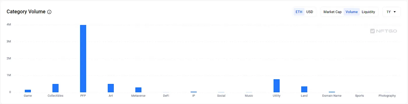 通过不同类型NFT的交易数据,我们可以发现在当下,PFP以绝对的受欢迎度位居交易额第一。而最著名的蓝筹NFT也大多数是关于PFP的。其次则是实用类NFT以及收藏类、艺术品类。
