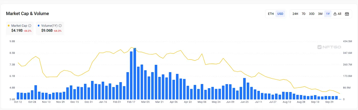 然而,2022 的下半年却成为对 NFT 领域来说艰难时刻。从Luna 暴雷,到 FTX 倒闭事件,对于整个加密生态都有着非常大的打击,虽然 NFT 依旧伴随着新项目的诞生和探索维持着热度,但奈何大环境的低迷也将 NFT 市场拽入了熊市。NFT 总市值已经从21年的最高点21B下降到如今(2023年10月8日)的4.2B,交易量也大幅度萎缩。
