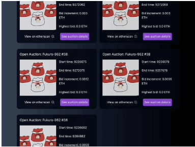 利用EIP-6551的创新交易方式:该项目利用EIP 6551创建了一个拍卖市场,用户可以在此市场上列出和竞标Fukuro包。Fukuro包:灵感来源于日本的福袋(Fukubukuro),也称为“幸运袋”。每个Fukuro都可以包含以太坊地址可以包含的任何东西,如其他NFTs、ERC20代币等。
