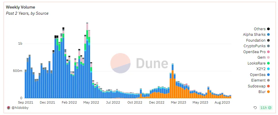 相比于 2021 年来看,今年的交易量整体大幅度下滑。NFT 缺乏创新性、可玩性导致的流动性下降问题也越来越严重。在近期,有 ERC-6551、Blur 的 Blend 借贷以及 Opensea 的 Deals 等功能出现,让大家有了一丝期待。因为这些熊市中的小迭代,可能都会是将来NFT市场回暖的关键因素。
