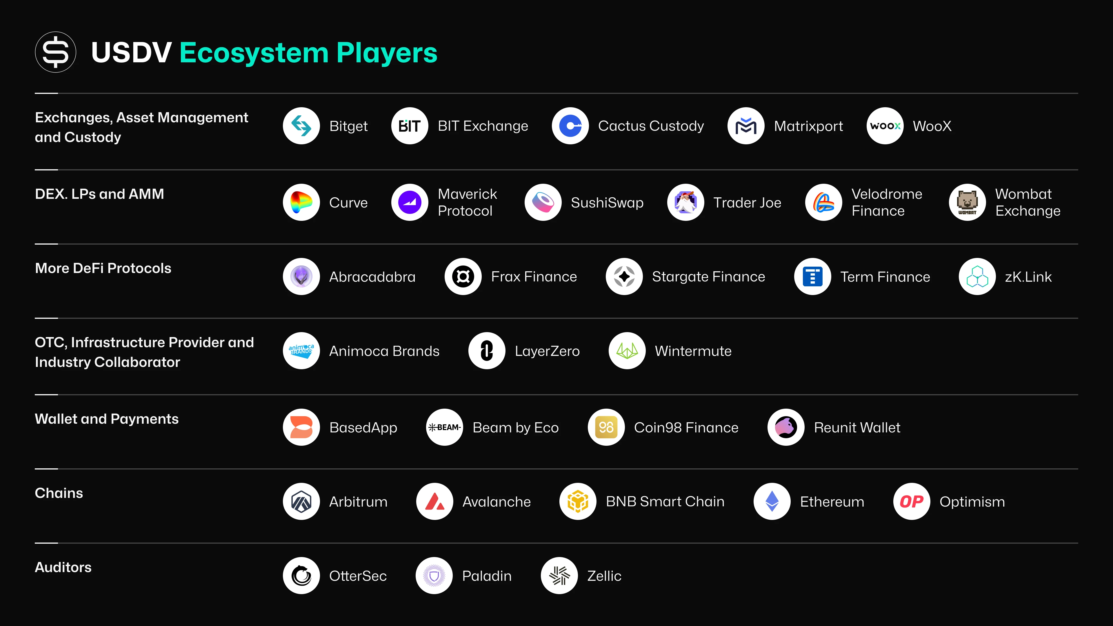 其中,Verified USD 基金会是生态主要推动者和支持者,最大的使命在于培育一个由贡献者组成的进步社区。此外, Matrixport 、LayerZero 等关键贡献者也在生态建设中扮演者不可或缺的角色,他们与 Curve 、Sushi、TraderJoe、 Stargate 等重要的 DeFi 设施一起,为共同合作壮大稳定币的生态规模而努力。