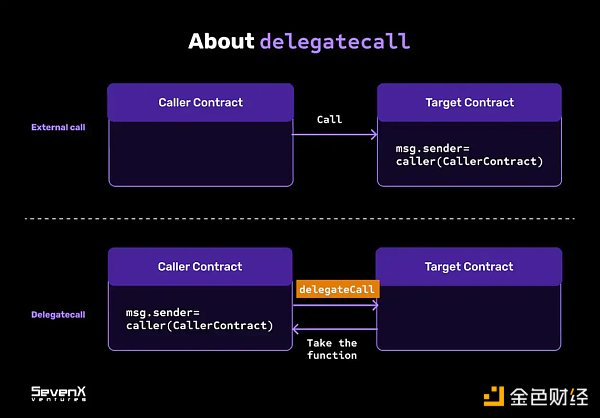 虽然「委托调用」与「调用」类似,但它不是在目标合约的 context 中执行,而是在调用合约的当前状态的 context 执行它。这意味着目标合约所做的任何状态更改都会更改调用合约的存储。