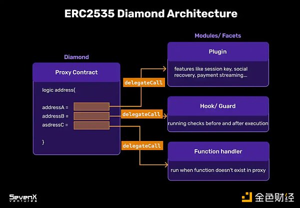 ERC2535 标准化的 Diamond 模型,这是一种模块化智能合约系统,可以在部署后升级/扩展,且几乎没有大小限制。目前,很多团队如 Zerodev 的 Kernel、Soul Wallet 的实验都受到了 Diamond 结构的启发。