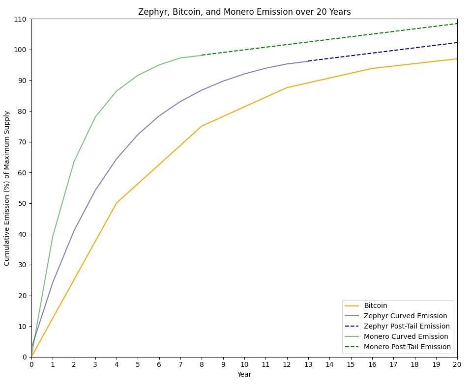 基础币 ZEPH 本身通过 PoW 算法挖矿获得,与门罗币相比,Zephyr 的排放曲线略慢。这种设计选择的目的是奖励早期采用者,减少对他们的稀释。同时减缓初始排放也降低了对 ZEPH 价格的潜在通胀影响,有利于算法稳定币系统的稳定性。