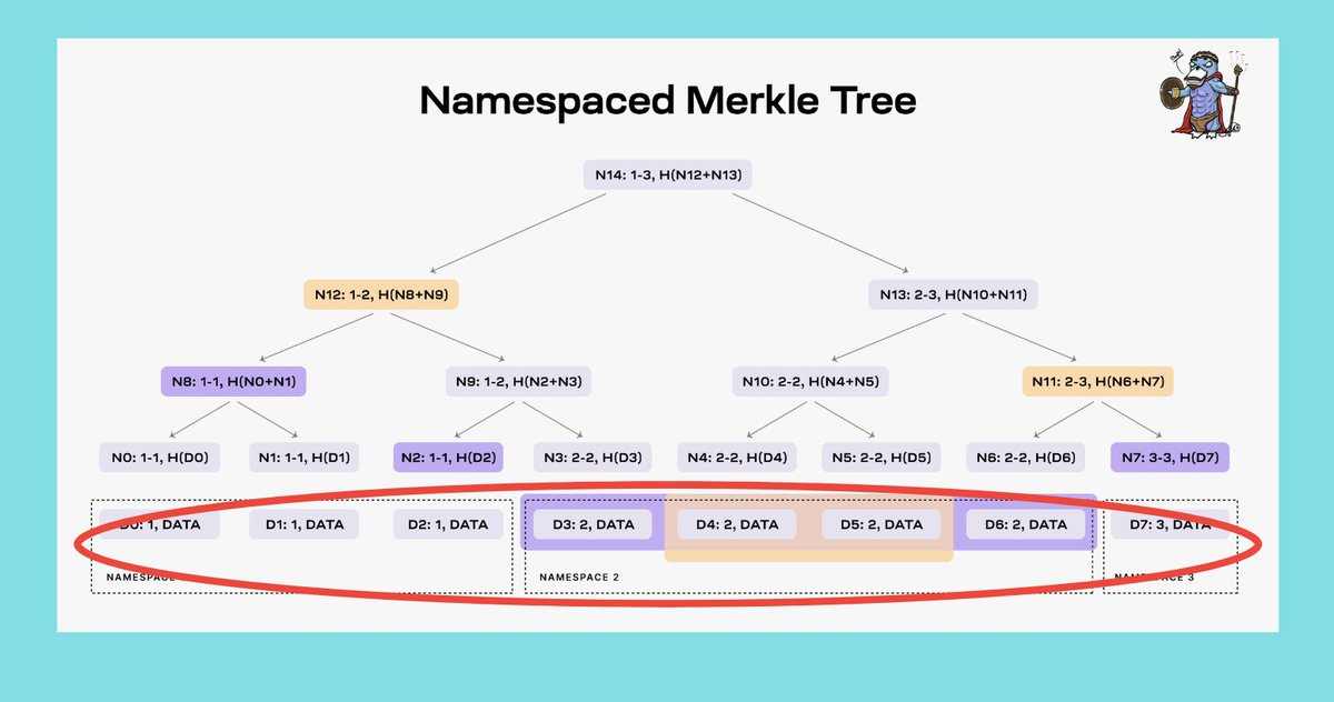 接下来,为了组织和验证数据,Celestia 使用 NMT 按命名空间标识符对数据进行排序。现在,Merkle 树中的每个节点都有一系列专属于该节点的命名空间,使 Celestia 能够提供有关数据完整性的证明。