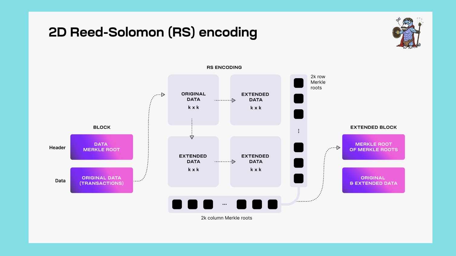 随着进行的抽样次数越多,对数据可用性的信心就越高。达到 99% 的置信水平后,数据被视为「有效」且可用。为了使 Celestia 中的 DAS 成为可能,他们采用了 2D Reed-Solomon 编码方案。