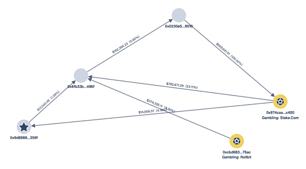 该地址也是在开盘后的35秒就购买了138,000,000枚GROK,目前价值$1,371,173。使用 Beosin KYT 反洗钱分析平台可以发现, 该地址资金来源于赌博平台,有大量的资金转移,属于风险地址。