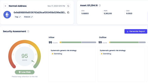 用户通过项目关系锁定相关地址后,可使用EagleEye对相关地址进行风险查询。以上述巨鲸为例,该地址曾经与黑地址进行过资金往来。