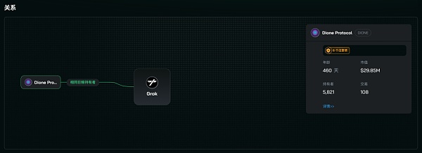 以GROK为例,EagleEye会对项目关系进行分析,显示GROK与Dione Protocol有相同的巨鲸,如下图所示。