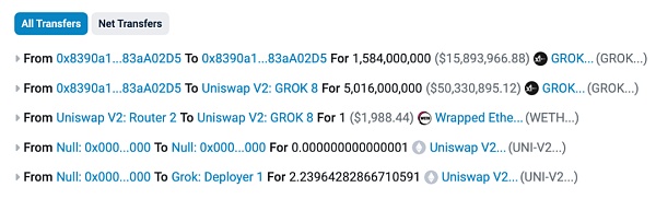 查询GROK代币部署者的链上信息,我们可以发现该部署者最开始只在Uniswap V2部署了50.16亿枚GROK和1个ETH的交易池子: