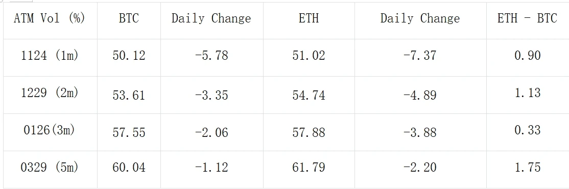 期权方面, 隐含波动率维持了近期和标的走势正相关的特性 , 出现了大幅回落 ,其中 BTC 近期整体下降约 3 ~ 4% Vol,ETH 下降约 5% 左右。与此同时 近期的 Vol Skew 也出现大幅回撤 ,ETH 前端部分期限 25 dRR 已经降至零值附近。