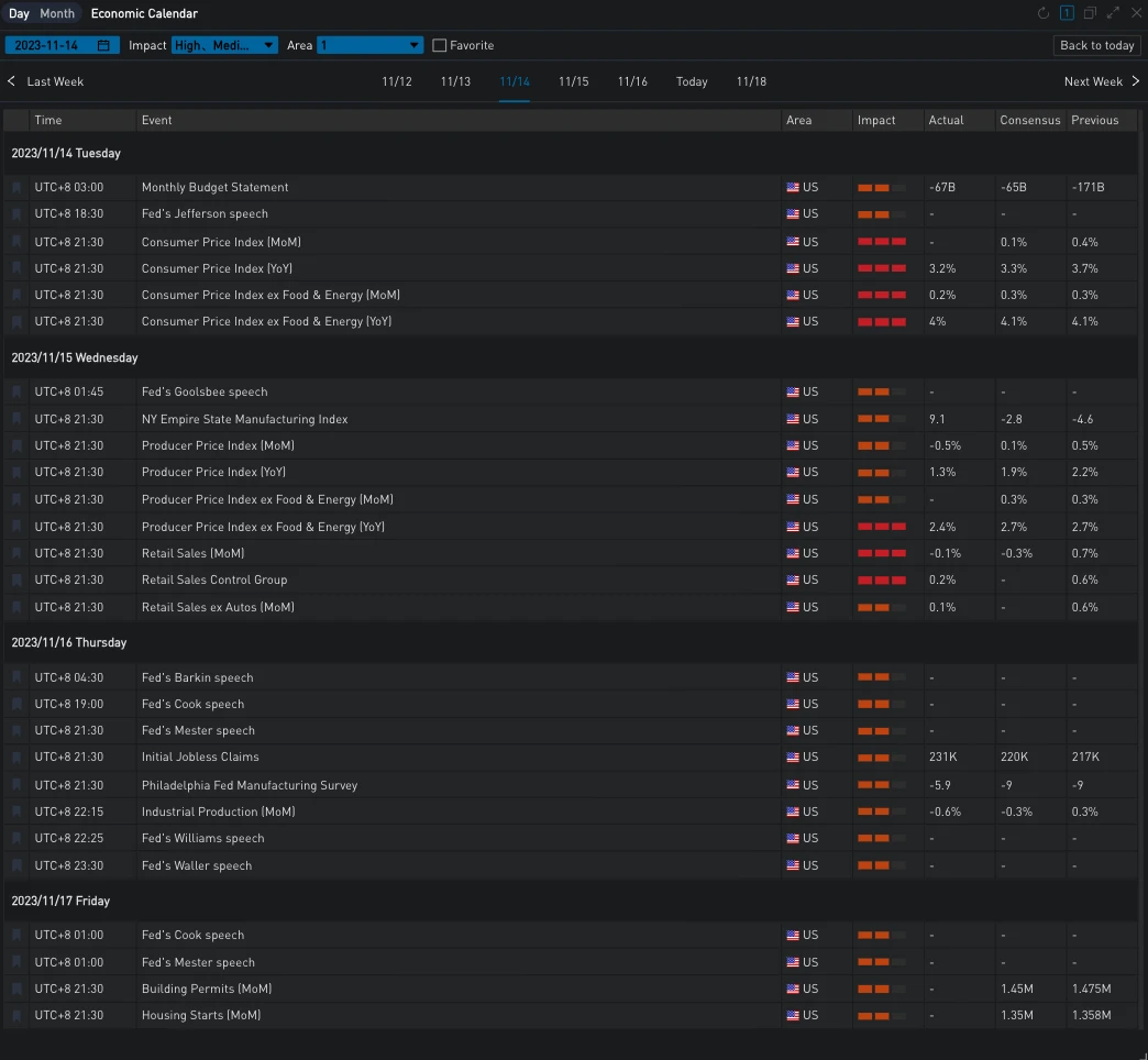 昨日(16 Nov)美国公布的初请失业金人数超预期增加到 23.1 万人,为近三个月以来最高水平,同时续请失业金人数也升至 186.5 万,为近两年来最高。 两组失业数据均显示了美国劳动力市场的疲软,进一步强化了市场对美联储暂停加息的观点 。截止目前,两年期/十年期美债 收跌 于 4.809% /4.392% 。美股股指呈 窄幅震荡 ,道指收跌 0.13% ,SP 500/纳指分别收涨 0.1% /0.12% 。