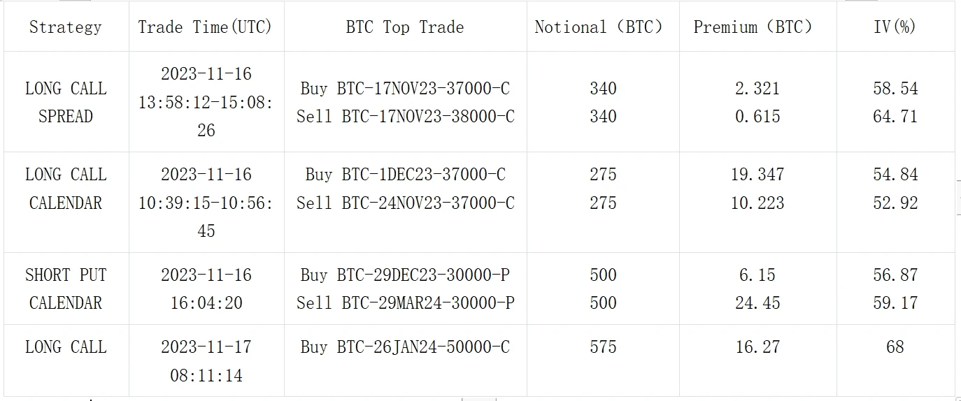 交易方面,BTC 购买看涨策略的热情明显减弱 ,但仍有诸如 17 Nov 37000 vs 38000 的 Call Spread 以及 卖短买长的 Call Calendar 延续了昨日的交易趋势。