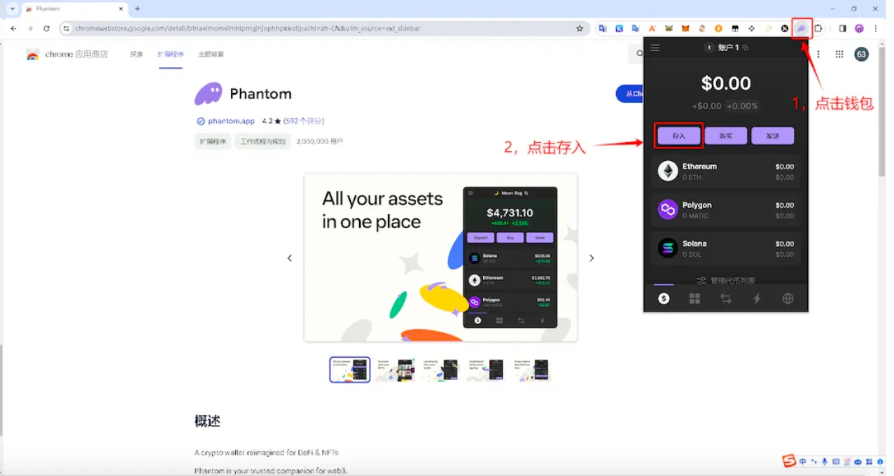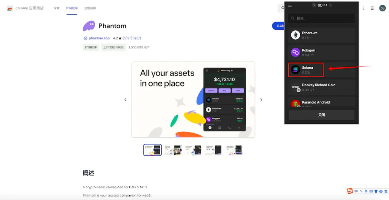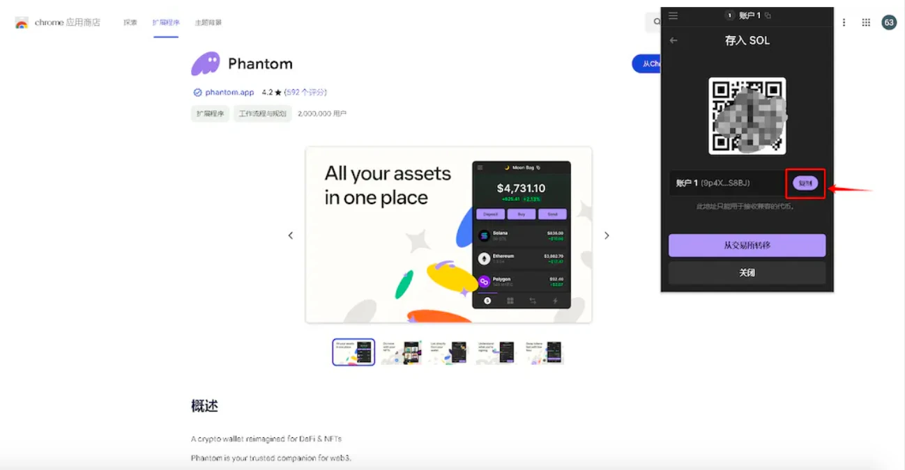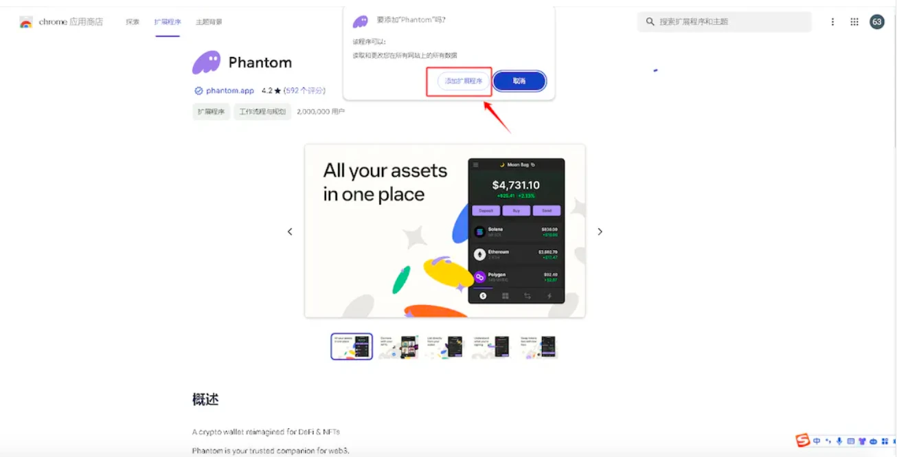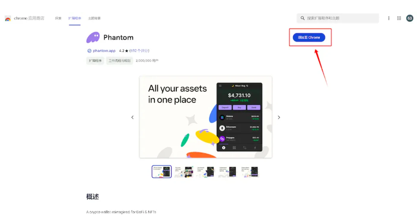1、打开下载钱包 phantom 插件网页,并点击 添加至 Chrome