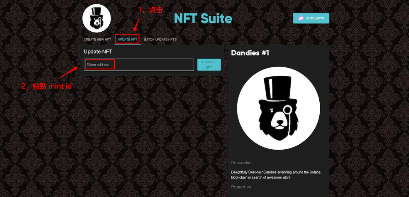 4、点击导航栏的 UPDATE NFT,并粘贴上面复制的 Mint ID