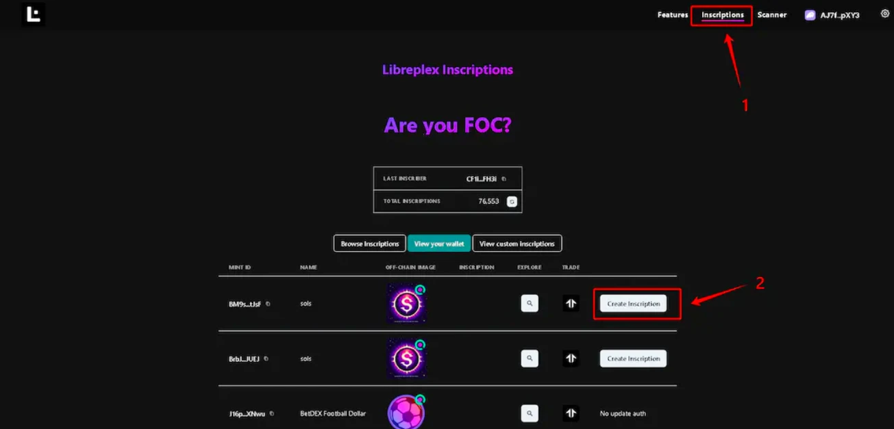 2、上方导航栏选择 Inscriptions ,并找到刚部署的 NFT,点击后面的 Create Inscription